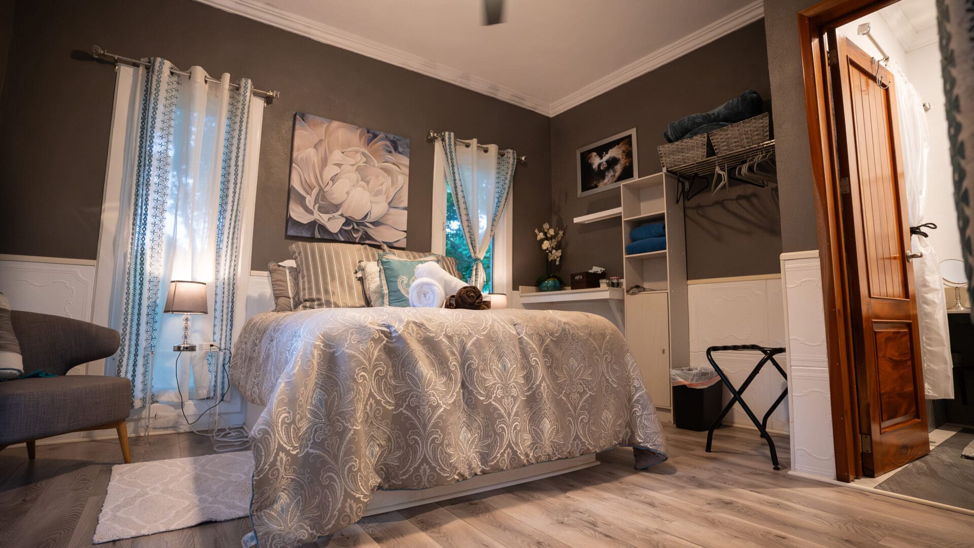 The Orquidea Suite is a stand-alone casita with a private patio overlooking a beautiful garden. From the large windows behind, there are views of another garden featuring a large Yaxnic or Walking Lady Tree. Amenities include: